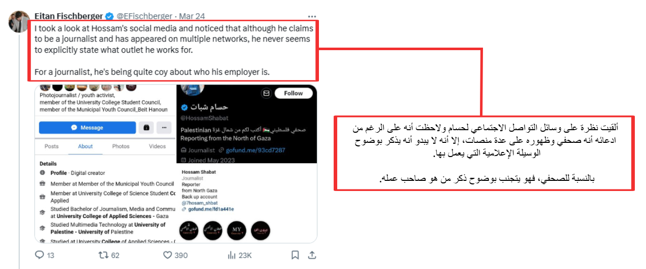 لقطة شاشة لمنشور إيتان فيشبرغر عبر منصة “إكس” بتاريخ 24 مارس 2024، يزعم فيه أن الصحافي حسام شبات يُخفي هوية الوسيلة الإعلامية التي يعمل فيها. المصدر: (المصدر: @EFischberger / أرشيف)