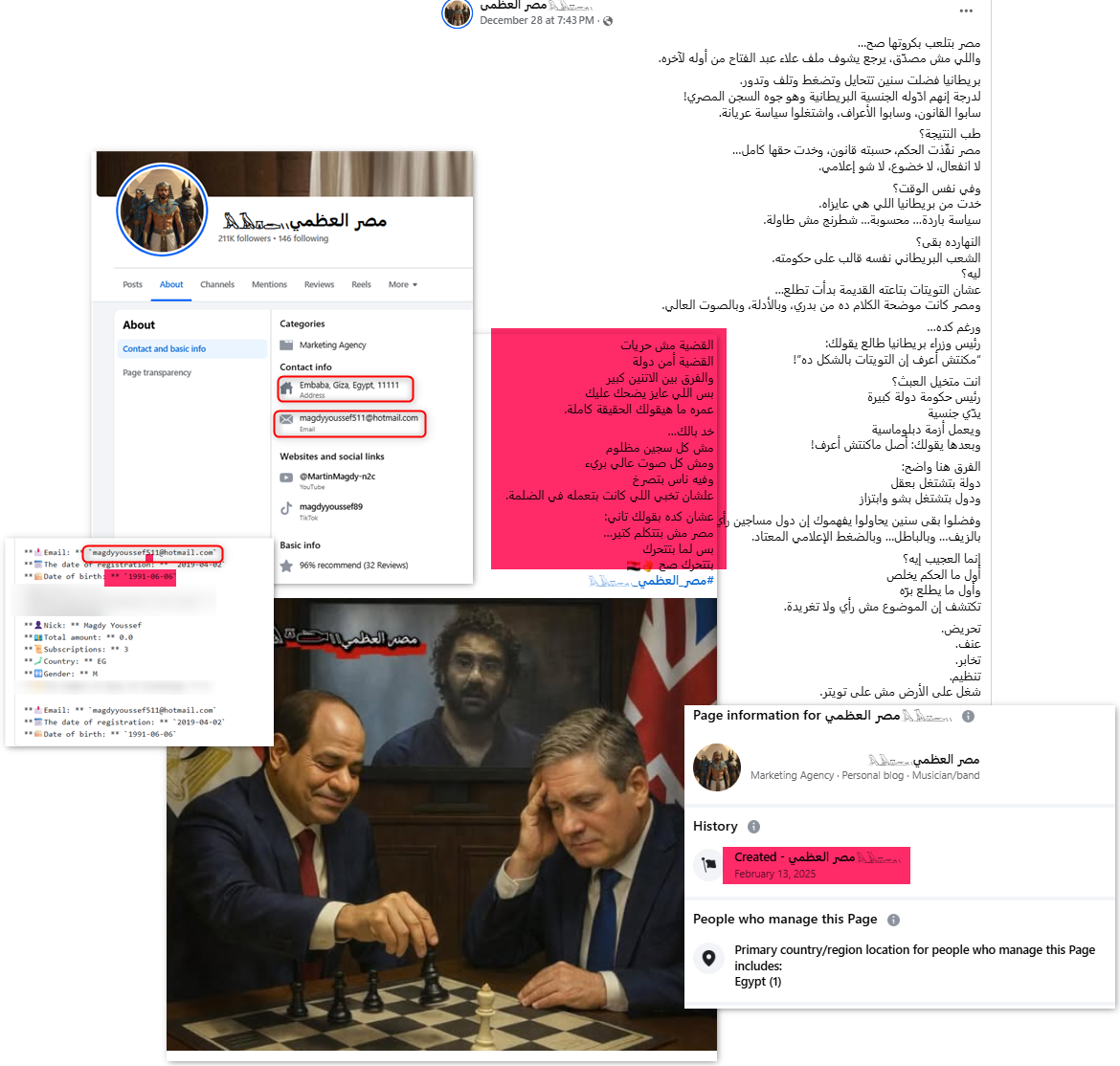 أول هذه الحسابات المركزية، صفحة على منصة "فيسبوك" تدعى "مصر العظمي𓅓𓄿𓎼𓂧𓏭"؛ وهي صفحة حديثة ظهرت في شباط/فبراير 2025، لكن منشوراتها بشأن علاء عبد الفتاح حظت بتفاعل كبير، كما أن المنشور قد قصد إلى تشويه المعتقلين "مش كل سجين مظلوم"، وتمجيد نظام الرئيس عبد الفتاح السيسي.
