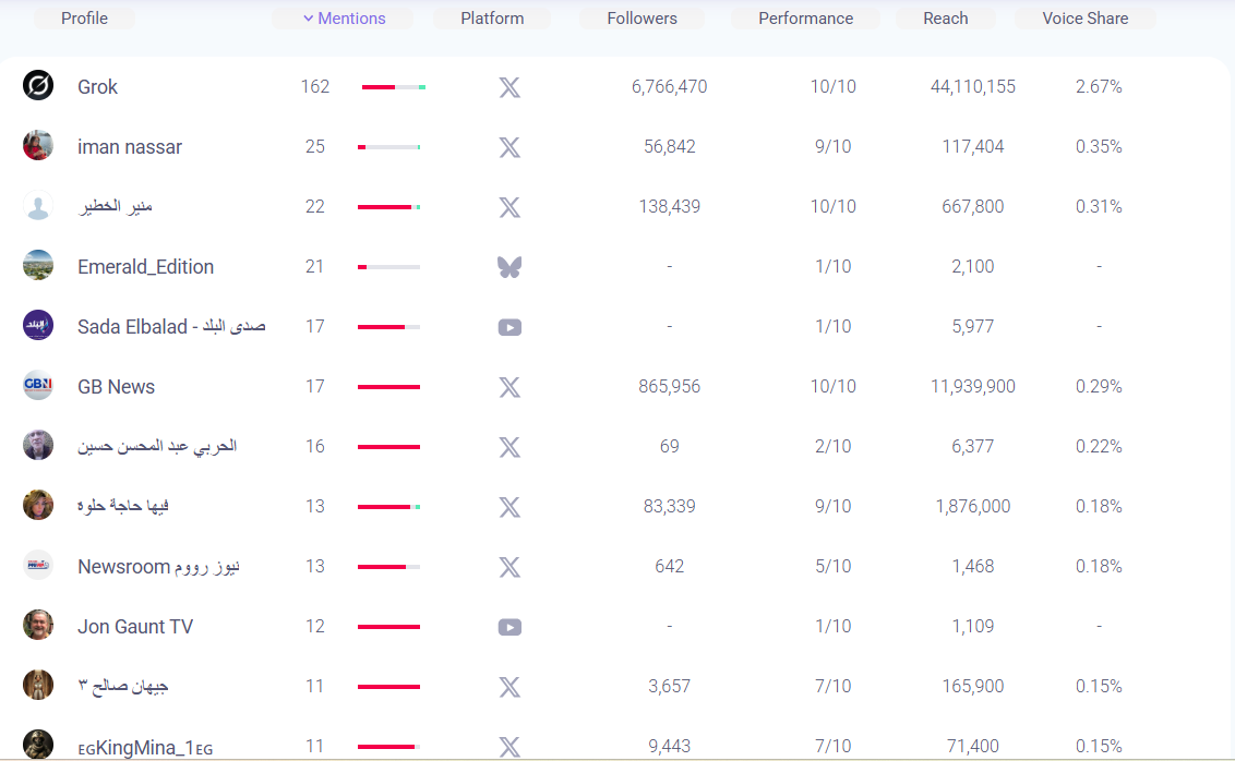 كشفت التحليلات عن قائمة من أبرز الحسابات التي شاركت في الحملة حول "علاء عبد الفتاح" على مختلف منصات التواصل التي تغطيها أداة Brandmentions، جاء في صدارتها حساب Grok الذي نشر 162 منشوراً بشأن "علاء عبد الفتاح"، ثم عدد من الحسابات المصرية التي نشرت بشكل "سلبي" عن عبد الفتاح.