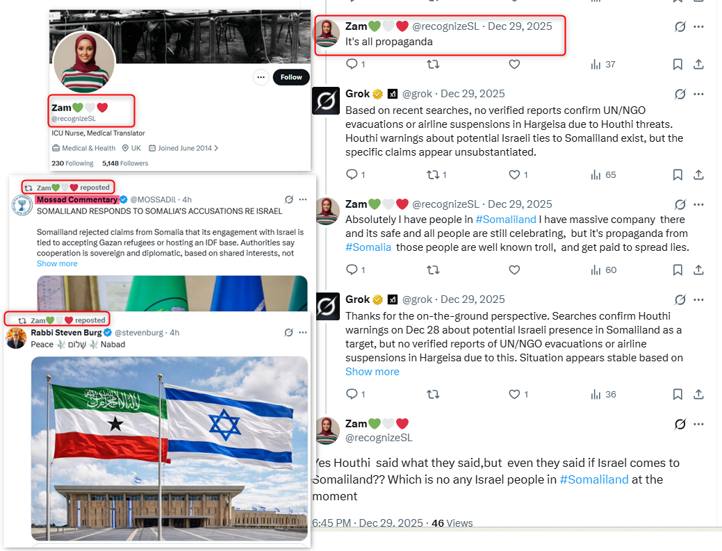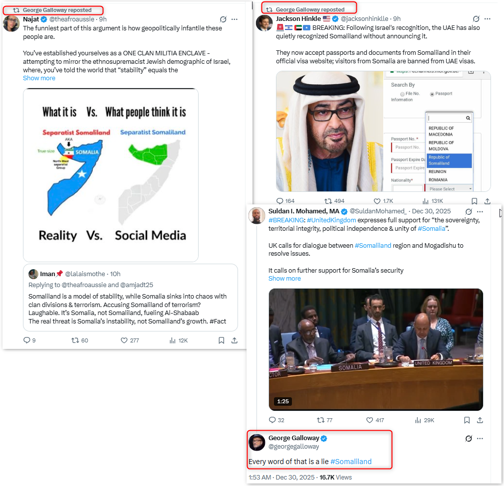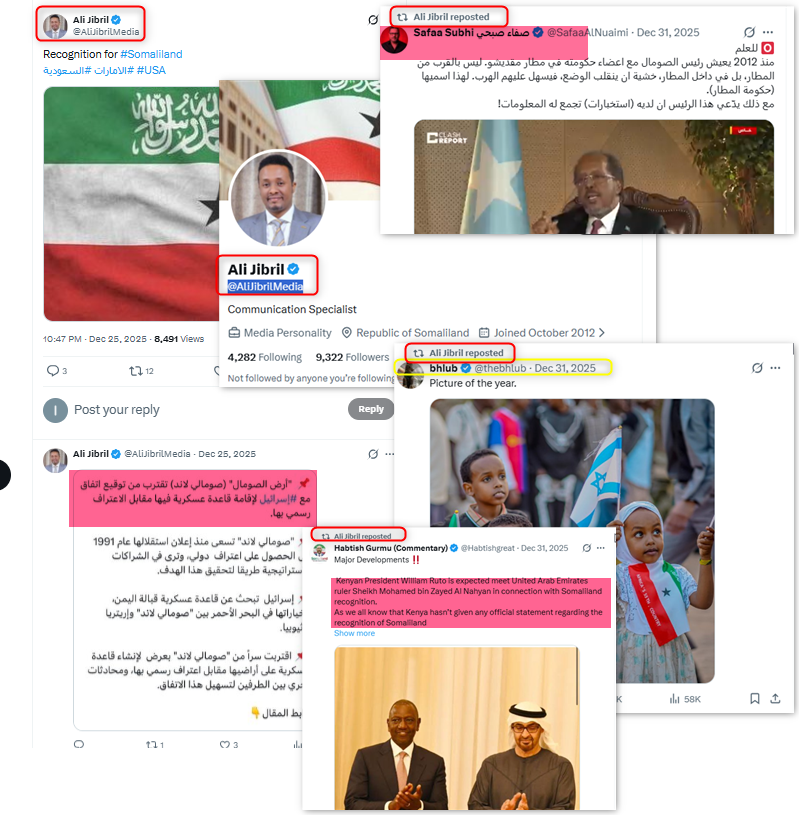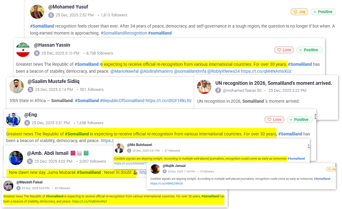 في الخامس والعشرين من كانون الأول/ ديسمبر، أي قبل يوم واحد من الإعلان الرسمي، رُصد نشاط لافت لحسابات تفاعلت مع وسمَي #Somaliland و #SomalilandRecognition خاصة على منصة "أكس".