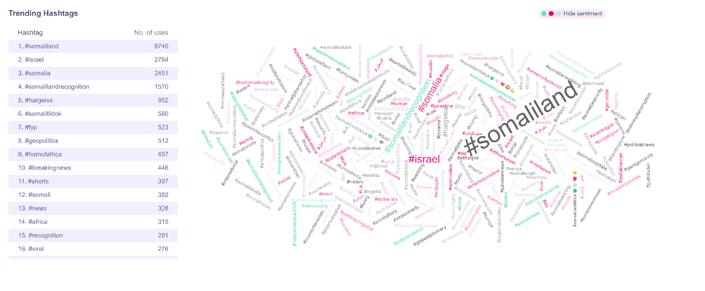 وقد انعكست هذه الاتجاهات على السحابة الكلامية لأكثر الوسوم والكلمات ظهورا في المنشورات، إذ يمكننا أن نرى وسم #Israel كثاني أكثر وسم ظهورا، قبلها جاء وسم #Somaliland وبعدها وسم #Somalia، وتلاهم وسم خاص بالاعتراف بأرض الصومال #SomalilandRecognition .
