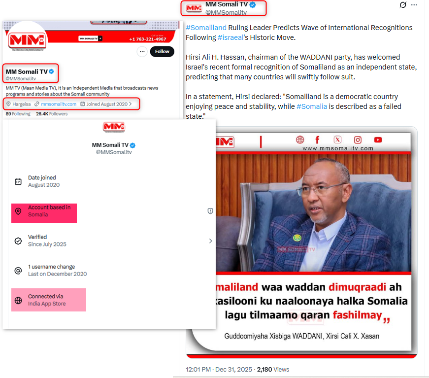 كما نشر حساب @MMSomalitv 49 تغريدة، وهو حساب حديث ظهر عام 2020، وحدد موقعه بهرجسيا عاصمة أرض الصومال، وقد أظهرت تغريداته تأييدا واضحا لإسرائيل، إلا أن فحص خاصية الشفافية للحساب أظهرت أنه يُدار من الهند!