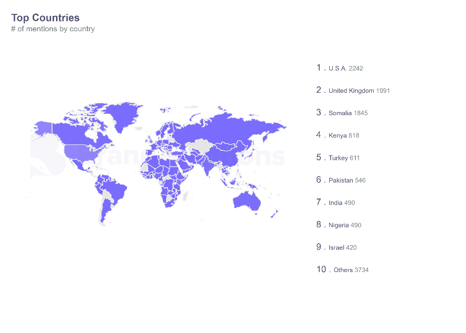 وهو ما يبدو منطقيا عندما نرى خريطة تحدد موقع أكثر الحسابات تفاعلا، حيث جاءت الولايات المتحدة في المركز الأول، تلتها المملكة المتحدة، ثم الصومال نفسها في المركز الثالث!