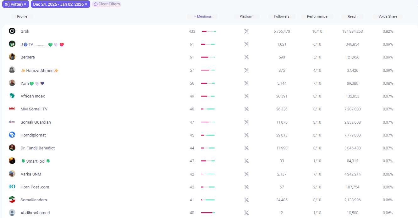 تصدرهم Grok الذي نشر 433 منشور، حسب تساؤلات المستخدمين حول الوضع السياسي لإقليم أرض الصومال، وموقف إسرائيل والإمارات منه، وعن علاقته بالحكومة المركزية بالصومال.