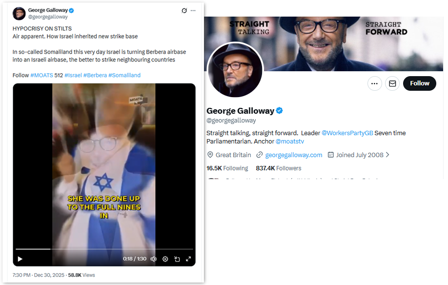 وقد مثل حساب " @georgegallowa" واحد من الحسابات المركزية الممثلة للاتجاه الآخر المعارض لاعتراف إسرائيل بأرض الصومال كجمهورية مستقلة، ومعارض لانفصال أرض الصومال، إلا أن الحساب بدى مندمج تماما مع بقية الشبكة ومجتمعاتها، ما يشير إلى أن الحسابات المؤيدة للانفصال والمتفاعلة مع الحملة هي نفسها التي تفاعلت مع حساب " @georgegalloway" وهاجمته.
