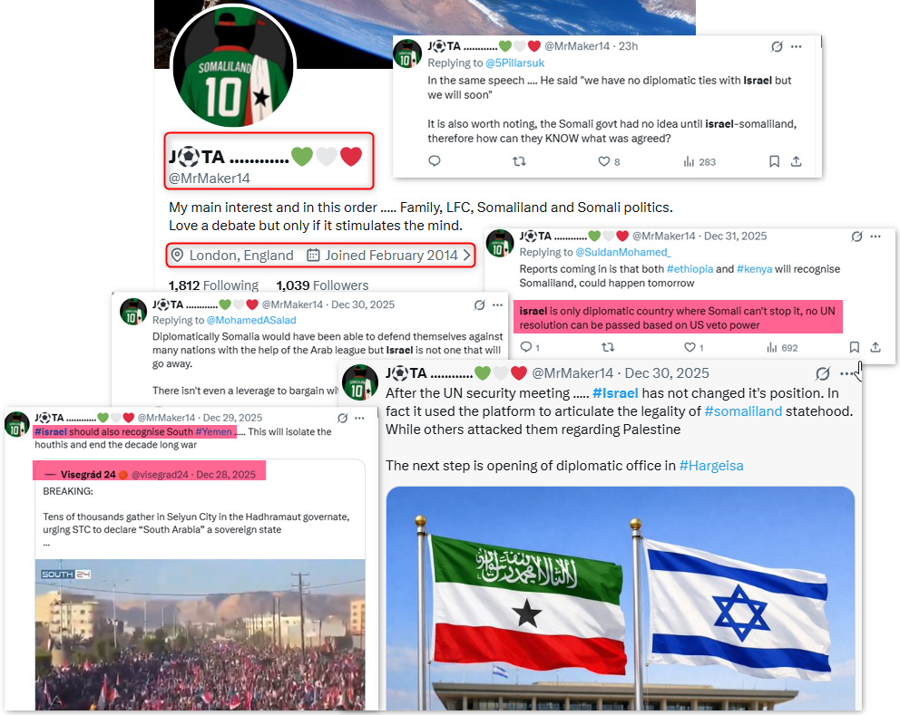 في منتصف نهار يوم 25 كانون الأول/ ديسمبر، ظهر حساب باسم ✨Hamza Ahmed✨"@ham0ooz"، وهو حساب يعود إلى 2017، لا يضع صورة شخصية حقيقية وحدد موقعه في أفريقيا، وتفاعل مع حساب الناشط الإماراتي المؤيد والداعم لإسرائيل "أمجد طه"، ونشر تغريدة تدعم انفصال جنوب اليمن بالتوزاي مع دعم انفصال أرض الصومال.