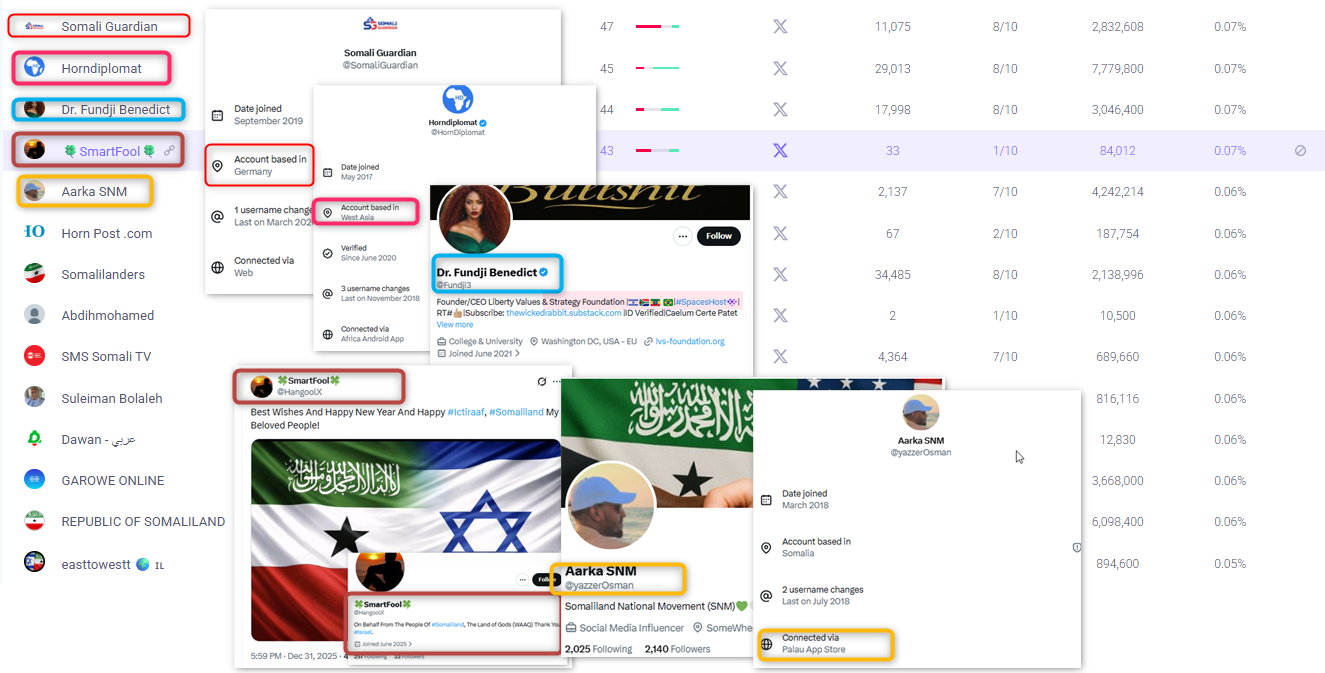 وهو ما تكرر مع عدد من الحسابات في قائمة الحسابات الأكثر نشراً، فقد أظهر فحص الحسابات والتحقق من خاصية الشفافية لديها أن أغلب الحسابات هي غير حقيقية، مؤيدة لإسرائيل، تغرد من خارج الصومال!