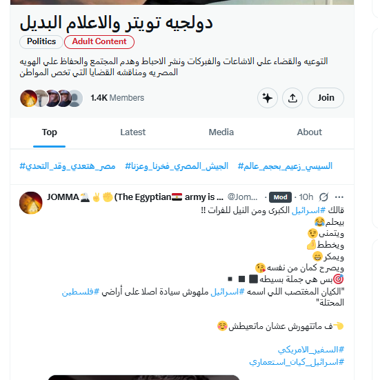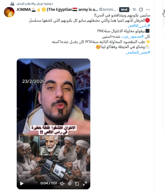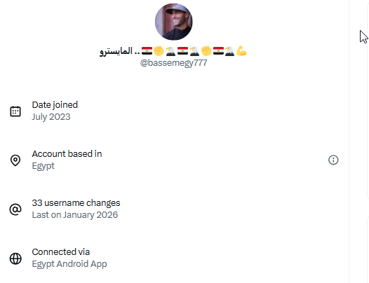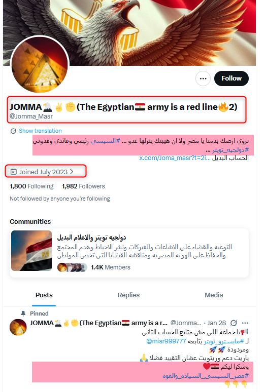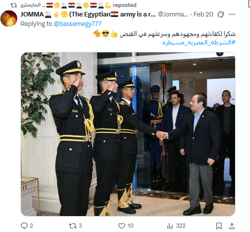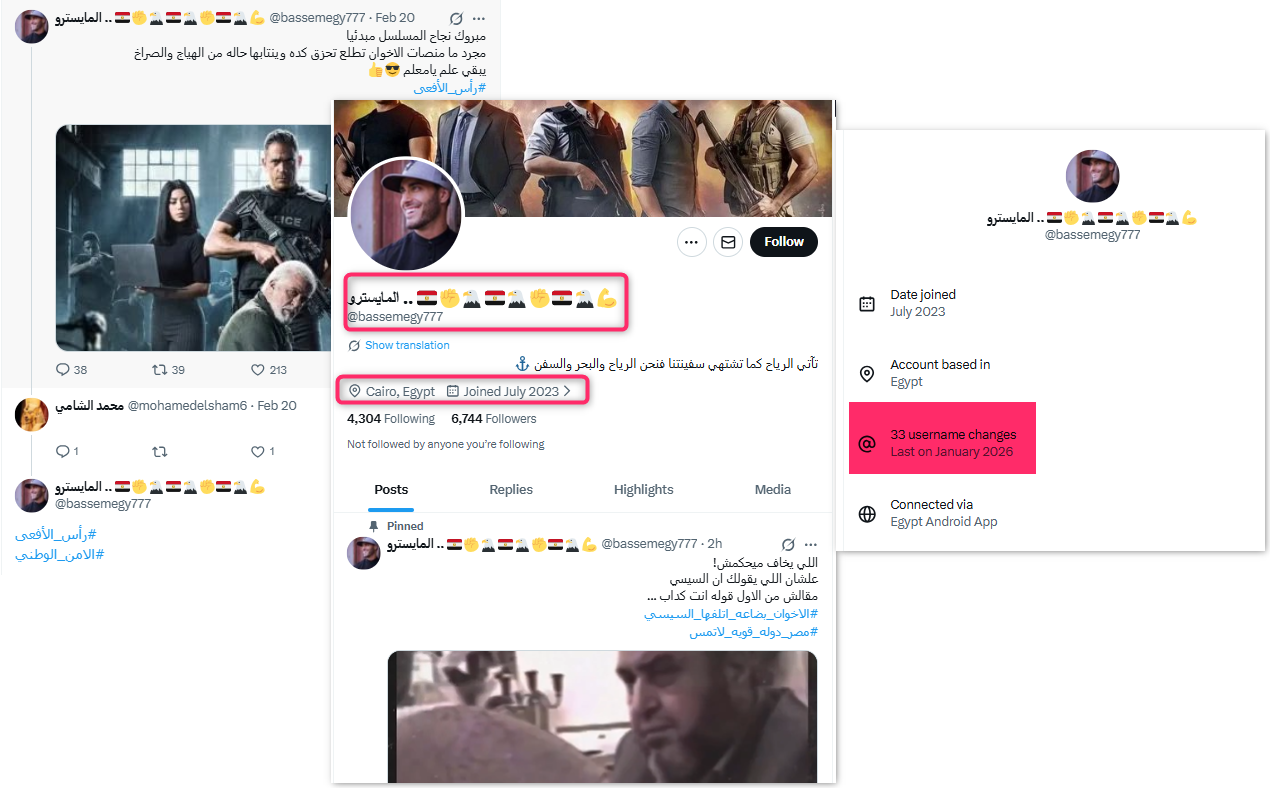 كما نشر حساب «المايسترو» @bassemegy777، وهو حساب حديث لا يستخدم هوية واضحة، 13 منشوراً تضمّنت الوسم ذاته، وتبيّن تفاعله مع شبكة الحسابات نفسها التي تضم الحساب @Jomma_Masr.