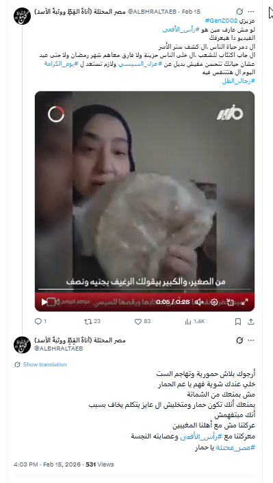 كما تفاعل الحساب مع حساب "@GenZ002_eg" الذي أُنشئ عام 2025، ولا يستخدم صورة شخصية، ويرتبط بالنطاق ذاته، وقد أظهرت خاصية الشفافية أنه غيّر اسمه ثلاث مرات، ويُحدَّد موقعه الجغرافي في أوروبا.