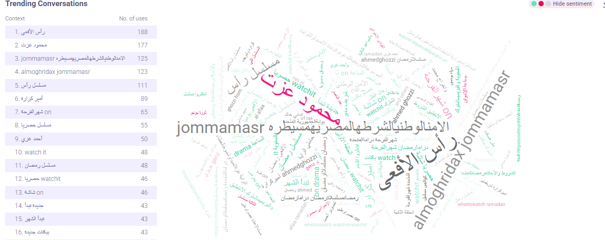 كما انعكس هذا التنوّع في الكلمات الأكثر تداولًا ضمن النقاشات المرتبطة بالوسمين؛ إذ برز اسم «رأس الأفعى» بوصفه الأكثر استخداماً، تلاه اسم «محمود عزّت»، إلى جانب كلمات مثل «الأمن الوطني» و«الشرطة المصرية».