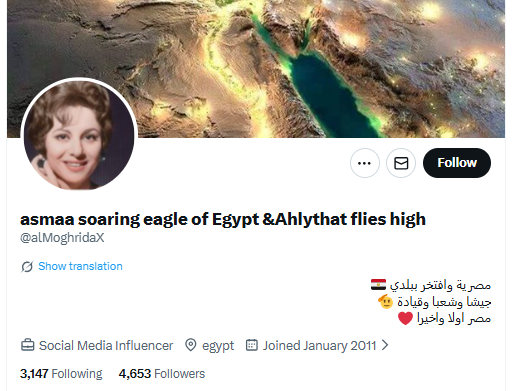 وفي المرتبة الرابعة، استخدم حساب "مصر المحتلة (أناةُ القِطِّ ووثبةُ الأسد) @ALBHRALTAEB" الوسمين #رجال_الظل و#رأس_الأفعى لتوجيه انتقادات للنظام السياسي في مصر. عبر 52 منشوراً. ويبدو أن الحساب لا يستخدم هوية شخصية واضحة أو اسماً حقيقياً.
