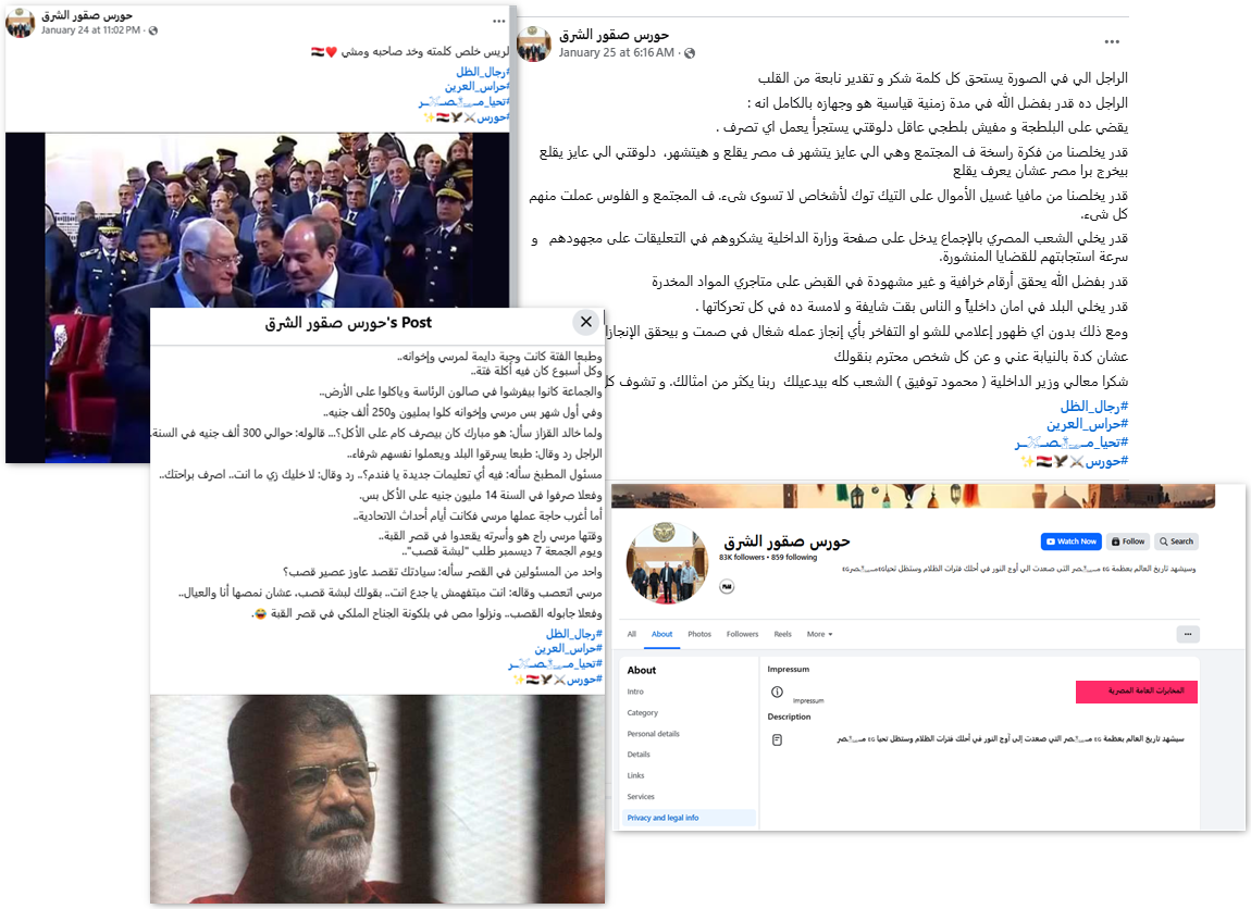 في 24 كانون الثاني/ يناير، وقبل أيام من الاحتفال بعيد الشرطة وذكرى ثورة 25 كانون الثاني/ يناير، نشر حساب يُدعى «حورس صقور الشرق» أكثر من 30 منشوراً تضمّنت ترويجاً للنظام السياسي في مصر وانتقادات لجماعة الإخوان المسلمين وفترة حكمها، مستخدماً وسم #رجال_الظل.