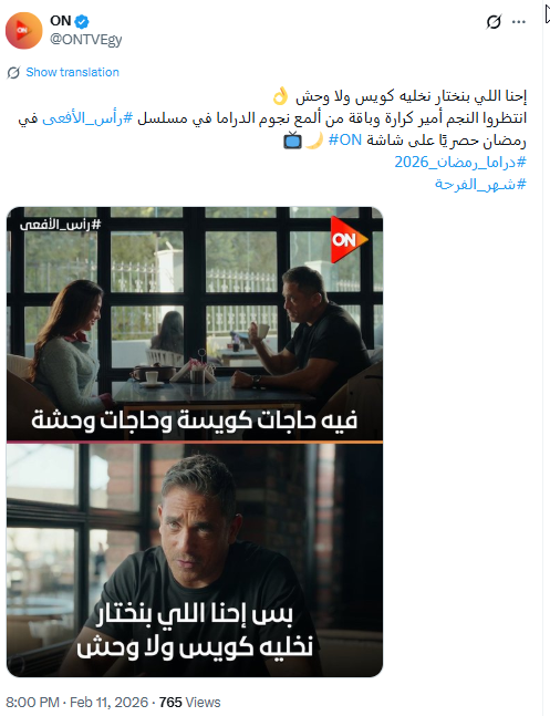 وفي المركز الثالث ضمن قائمة الحسابات الأكثر تفاعلاً ظهر حساب قناة @ONTVEgy، الذي نشر 52 منشوراً تضمنت وسم #رأس_الأفعى، في سياق ترويجي للمسلسل.