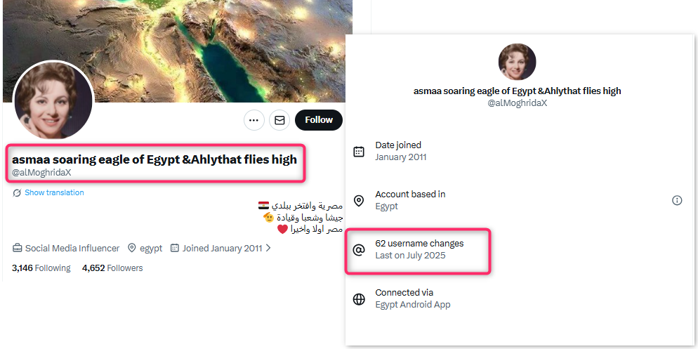 كما تفاعل الحساب ذاته مع حساب "@alMoghridaX"، الذي أظهرت خاصية الشفافية أنه غيّر اسمه 62 مرة، كان آخرها في يوليو 2025.