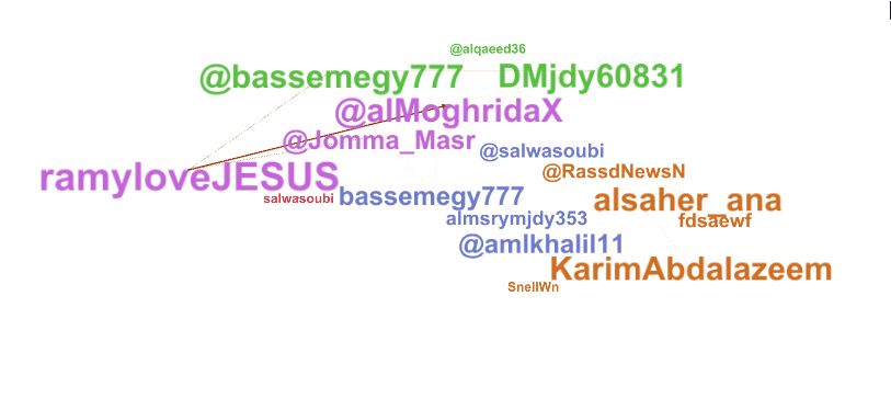 وجاء بعده حساب يحمل اسم المستخدم "@ramyloveJESUS"، الذي نشر 14 تعليقاً خلال فواصل زمنية قصيرة على منشور لحساب آخر يدعى " @alMoghridaX" تضمّنت إعادة نشر تغريدة لحساب ثالث هو @Jomma_Masr، استخدم فيها وسم #الشرطة_المصرية_مسيطرة. واقتصرت تعليقات الحساب الأول على استخدام الوسوم #رأس_الأفعى و#الأمن_الوطني و#الشرطة_المصرية_مسيطرة.