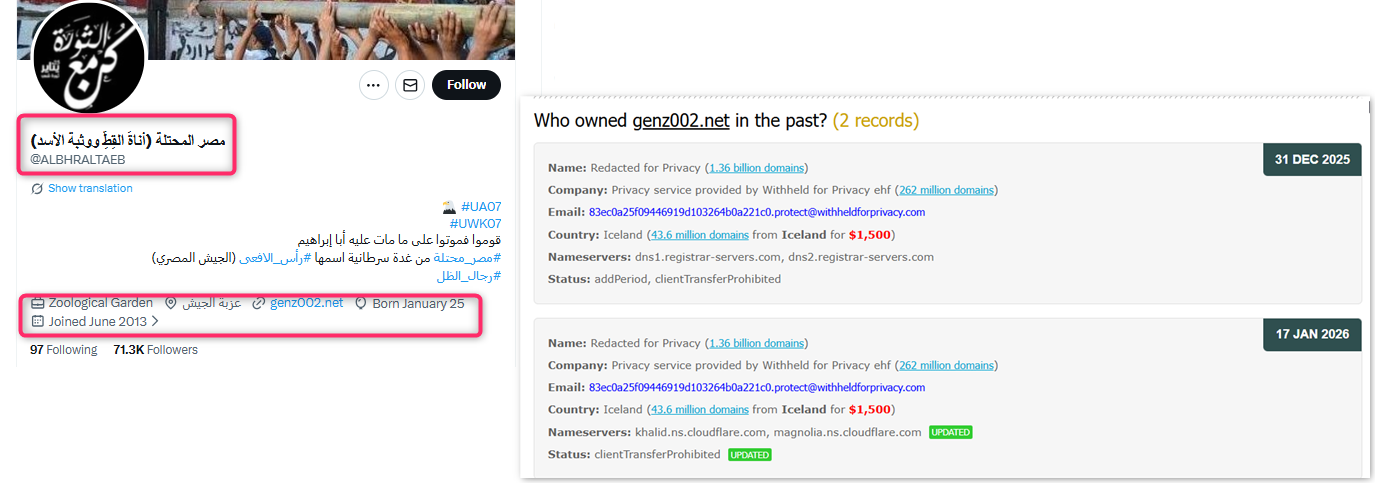يرتبط الحساب بموقع إلكتروني يحمل النطاق genz002.net، المتربط بالناشط المصري "أنس حبيب"، وهو موقع إلكتروني يدعو لاستفتاء على عزل الرئيس المصري . ويظهر فحص بيانات النطاق أنه سُجل في 31 تشرين الأول/ أكتوبر 2025، في أيسلندا، مع تفعيل خدمة لحماية بيانات المالك.