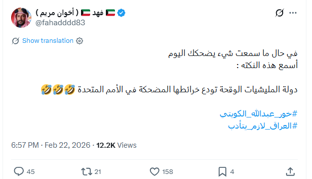 نشر 28 تغريدة مرتبطة بوسم #خور_عبدالله_كويتي، تضمنت خطاباً تحريضياً وسباً للعراق والشعب العراقي. الحساب كويتي غير شخصي، أنشئ عام 2017، واسم المستخدم يتكون من حروف وأرقام عشوائية، ويظهر الاتصال بمنصة "إكس" من الولايات المتحدة.