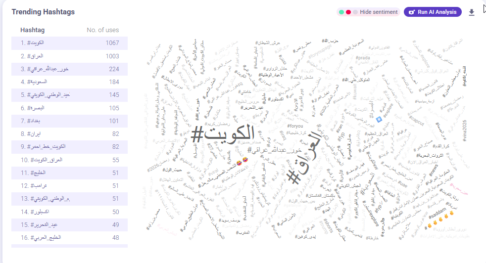 أظهرت قائمة الوسوم الأكثر تداولاً حضوراً واضحاً للخطاب المرتبط بالتوتر بين العراق والكويت. فإلى جانب وسم #خور_عبدالله_كويتي، برزت وسوم مثل #الكويت_خط_احمر و#العراق_الكويت، في مقابل وسم مضاد هو #خور_عبدالله_عراقي.