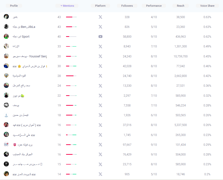 تصدرت قائمة الحسابات الأكثر تفاعلاً خلال فترة الرصد، وفق تحليل أداة Brand Mention، الحسابات التالية: