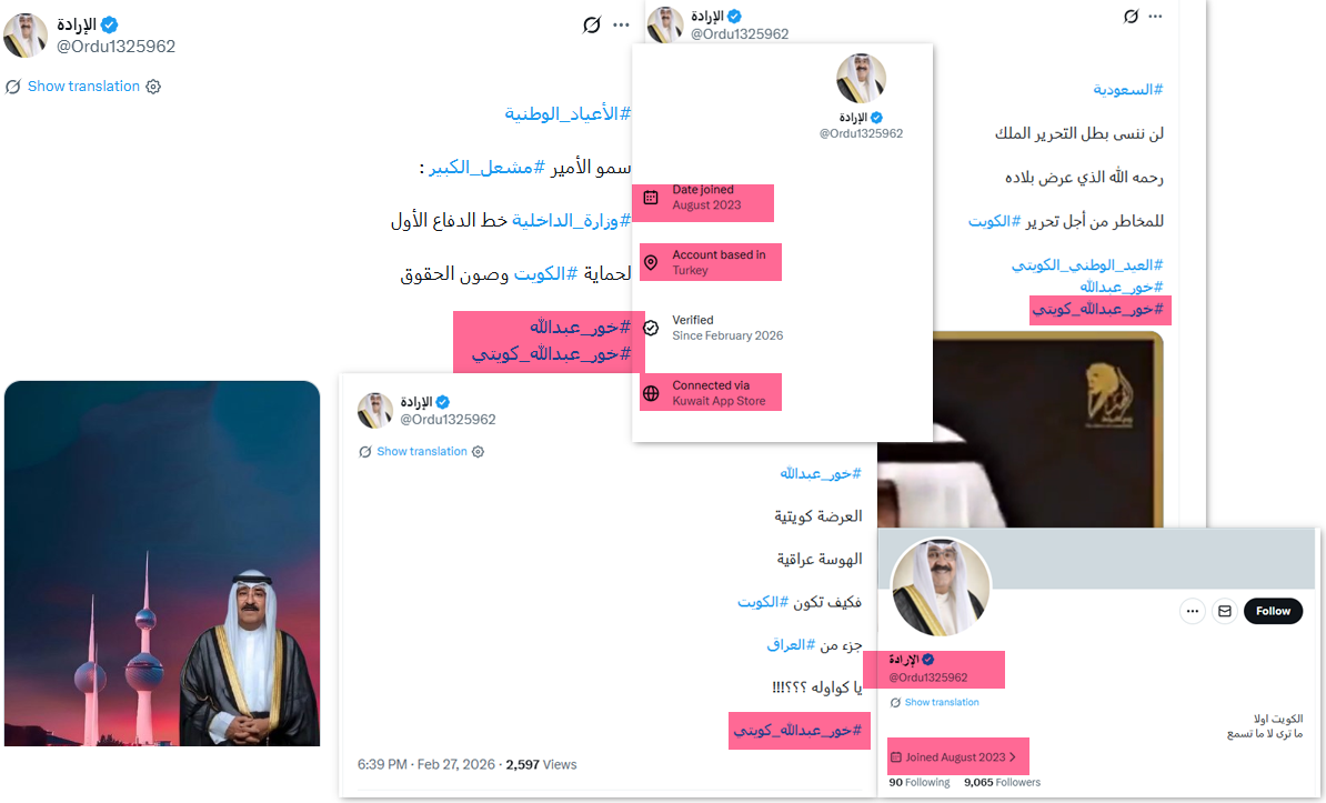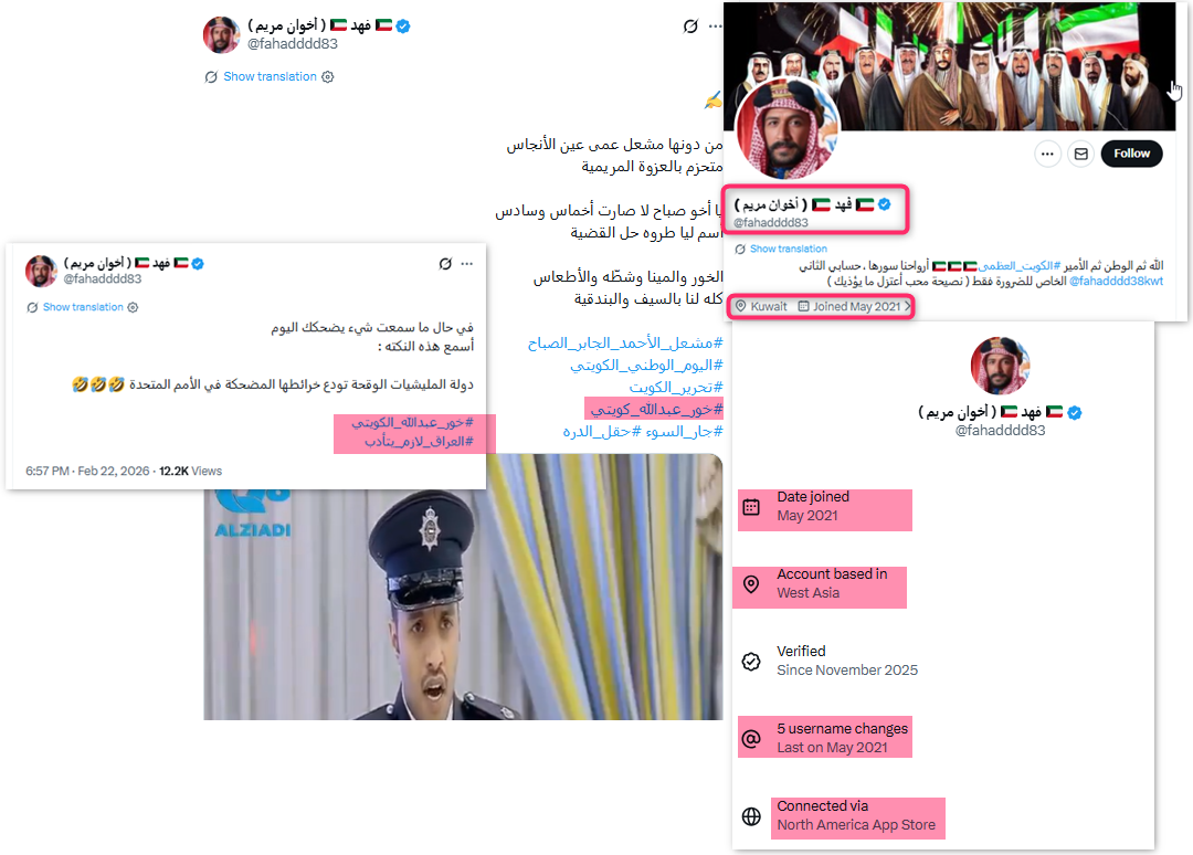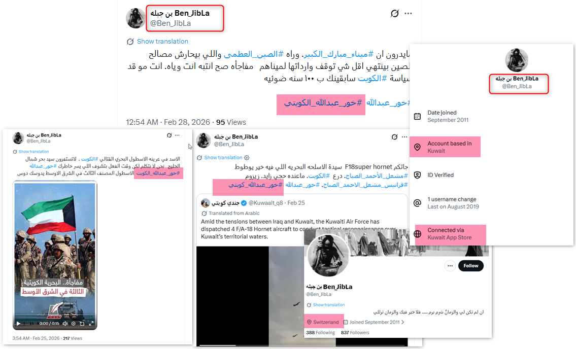 الحساب كويتي ينشط من الكويت، إلا أن الاتصال بمنصة "إكس" تم من الولايات المتحدة، ولا يستخدم صورة شخصية أو اسماً حقيقياً.