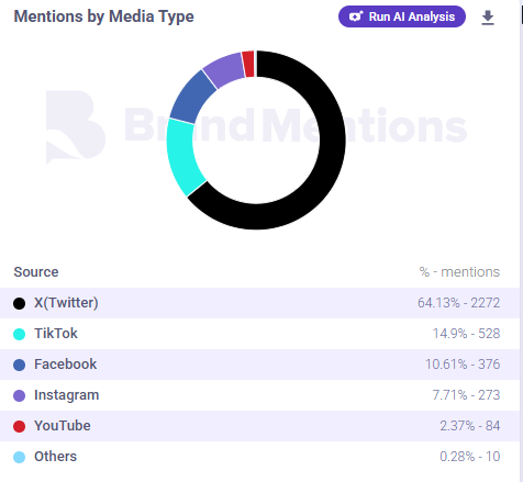 استحوذت منصة "إكس" على النسبة الأكبر من إجمالي المنشورات المرتبطة بالوسوم، إذ نُشر عبرها نحو 64 بالمئة من المحتوى، وجاءت منصة "تيك توك" في المرتبة الثانية بنسبة تقارب 15 بالمئة، تلتها منصة "فيسبوك" بنسبة نحو 11 بالمئة، بينما توزعت النسبة المتبقية على منصات أخرى.