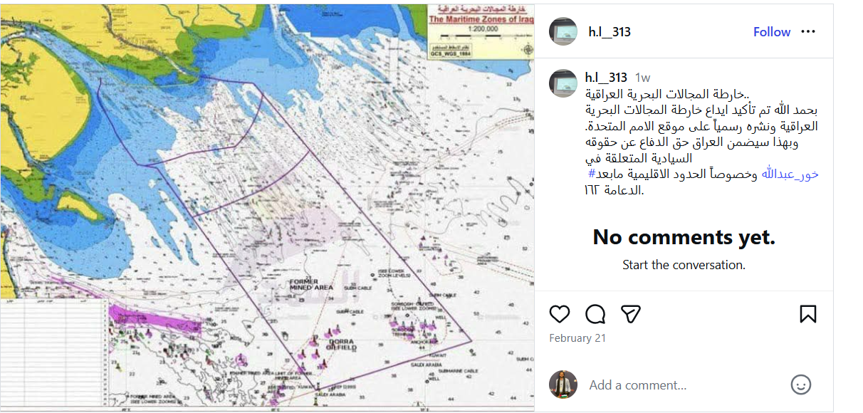 خريطة المجال البحري العراقي المقدَّمة إلى الأمم المتحدة، وتتضمن جزءاً من خليج خور عبد الله، مع صياغة منشورات متطابقة مع ما نشره النائب حيدر السلامي.