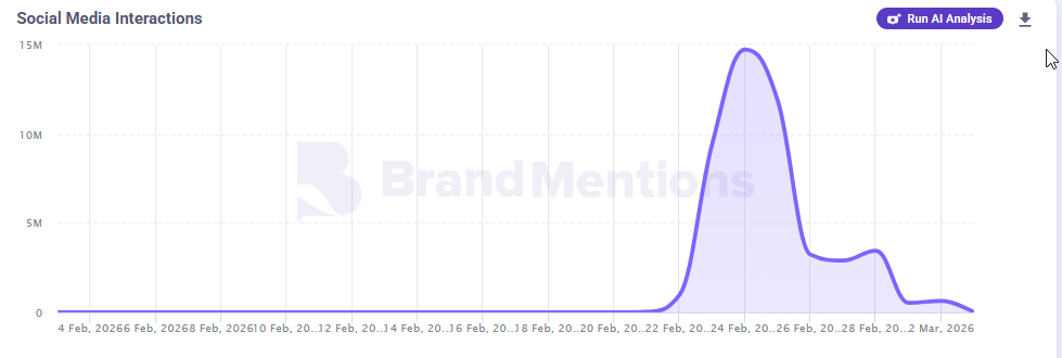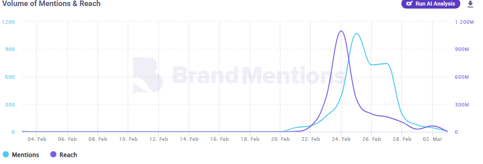 رسم بياني يوضح تصاعد النشاط المرتبط بالوسوم منذ 21 شباط، وصولاً إلى ذروته في 25 شباط.