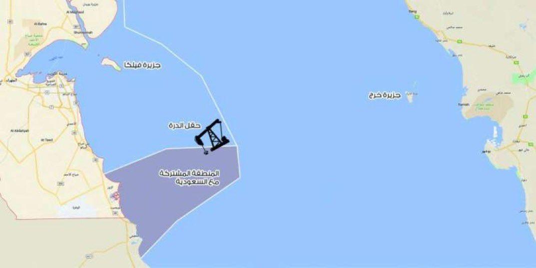 موقع حقل الدرة النفطي، مع ادعاءات بأن العراق أعاد رسم حدوده البحرية. مصدر الصورة: جريدة الراي.