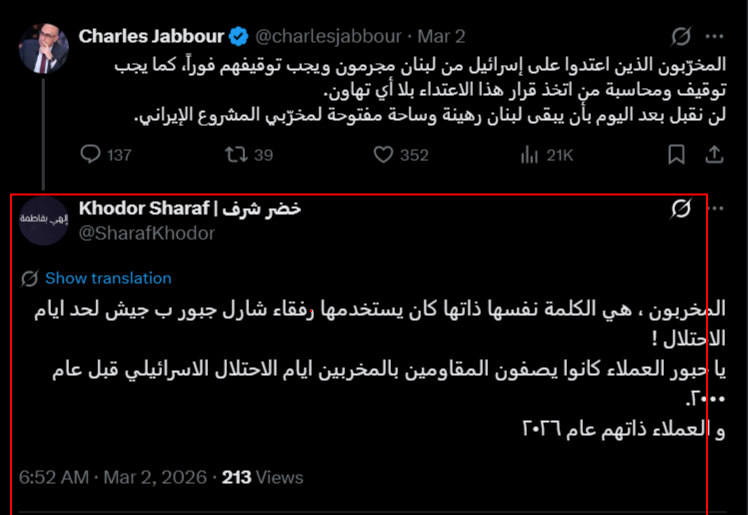 فقدم سُجل أقدم ظهور لوسم #حزب_الله_الارهابي في 1 آذار/ مارس عند الساعة 00:41 عبر الحساب @motamard_B. كما ظهر تعبير "جيش لحد" داخل النصوص في 1 آذار/ مارس عند الساعة 00:56 عبر الحساب @AbnQlwb38725، بينما ظهر الوسم #جيش_لحد في 3 آذار/ مارس عند الساعة 06:07 عبر الحساب @Ahmadabed1812.