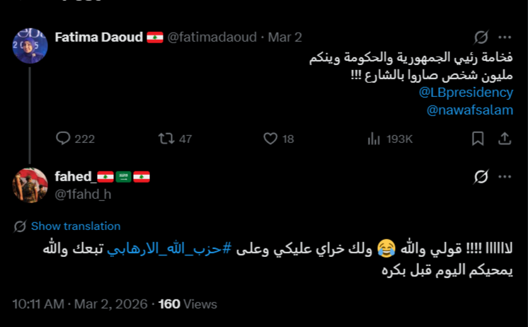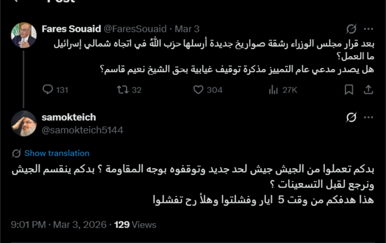 نقاش واسع حول القصف في الضاحية الجنوبية لبيروت، وعنقود هجومي يهاجم حزب الله، وعنقود أصغر لكنه أكثر حدّة يهاجم الجيش اللبناني عبر توصيفه بـ"جيش لحد".