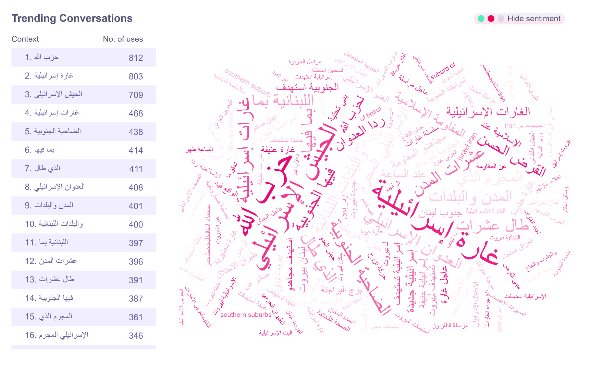 وفي 6 آذار/مارس نقلت رويترز تصاعد القصف الإسرائيلي على الضاحية الجنوبية وإصدار أوامر إخلاء واسعة، وهو ما يفسر تضخم النقاش الرقمي المرتبط بالضاحية إلى ذروته.