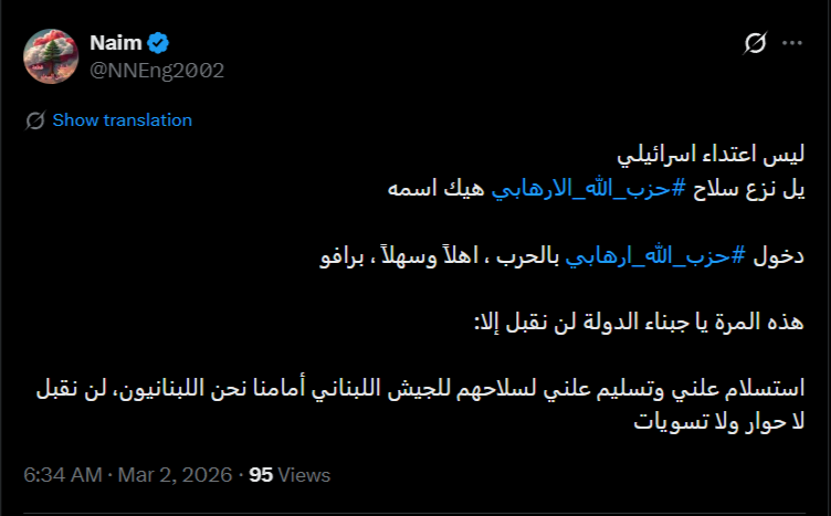 ويتسق هذا التدرج الزمني مع تطورات سياسية وعسكرية موثقة؛ إذ أفادت رويترز 2 آذار/مارس بأن الحكومة اللبنانية أعلنت حظر الأنشطة العسكرية لحزب الله، وأن رئيس الوزراء نواف سلام أكد حصر قرار الحرب والسلم بيد الدولة.
