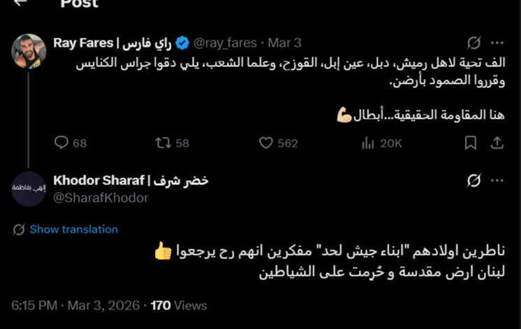 وعند توسيع النظر إلى كامل التصدير، تظهر مؤشرات على أن العداء اللفظي تجاه حزب الله سبق الموجة الأساسية إذ ظهر منذ 26 شباط/ فبراير، كما ظهرت عبارة “جيش لحد” ووسمها قبل 1 آذار/ مارس أيضًا. ويشير ذلك إلى أن ما حدث بعد هذا التاريخ لم يبدأ من فراغ؛ بل استند إلى قوالب لغوية وخطابية كانت موجودة مسبقاً، قبل أن تتكثف مع تصاعد الأحداث.