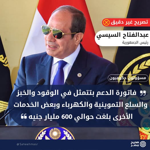 صرّح الرئيس المصري عبد الفتاح السيسي، خلال لقائه طلبة أكاديمية الشرطة قبل أيام، بأن "فاتورة الدعم تتمثّل في الوقود والخبز والسلع التموينية وأسعار الكهرباء وبعض الخدمات الأخرى بإجمالي يناهز 600 مليار جنيه".