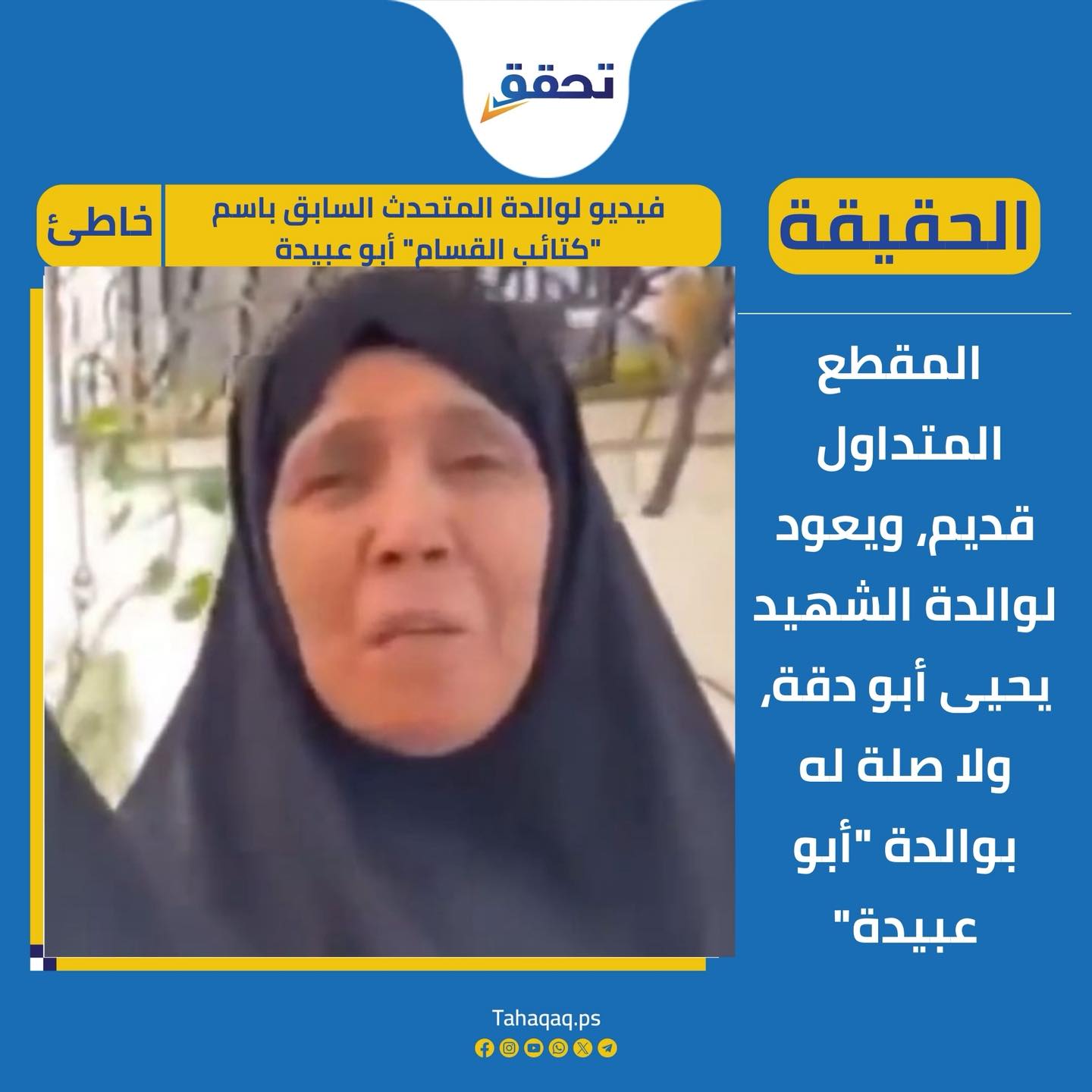 وفي سياق متصل، قام المرصد الفلسطيني نفسه بالتحقّق من مقطع آخر، أُرفق بادعاءٍ مفاده أنه يوثّق الظهور الأول لوالدة "أبو عبيدة". وتبيّن للمرصد أن المقطع قديم، ويعود إلى والدة أحد ضحايا حرب الإبادة الإسرائيلية على غزة، ويُدعى يحيى أبو دقة، وليس لوالدة المتحدث باسم "القسام".