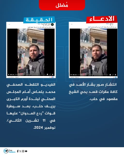 وجدت منصّة "ترو بلاتفورم" السورية أن الادعاء مضلّل، وأن المقطع الأصلي يعود إلى عام 2024، ويوثق إزالة صورة بشار الأسد، عقب عملية "ردع العدوان"، وسيطرة قوات هيئة تحرير الشام آنذاك على بلدة أورم الكبرى بريف حلب الغربي.