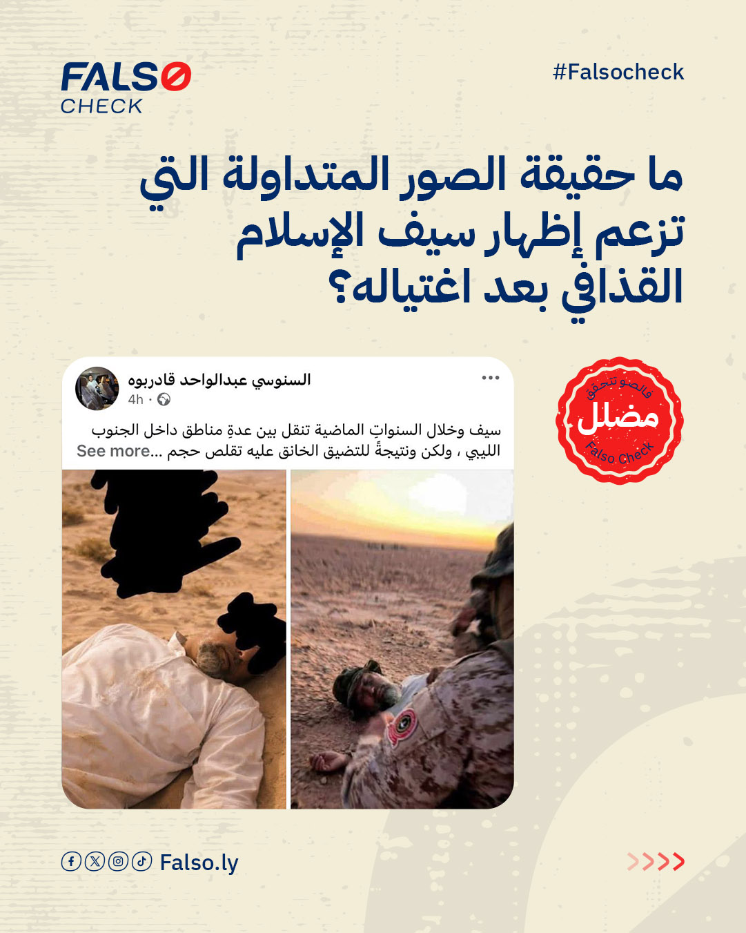 تحقّقت منصّة فالصو تتحقّق الليبية من الصور، وأثبتت أنها مولدة بالذكاء الاصطناعي، حيث كشف تحليل الصور عن ظهور تشوه في أطراف الجندي بجانب الجثمان، بالإضافة إلى ظهور أصابع يد سيف الإسلام اليمنى كاملة، وهو ما يناقض الواقع الموثق منذ سنوات، وتحديداً في ظهوره بمدينة سبها عام 2021، والذي يثبت بوضوح أن أصابع في يده اليمنى مبتورة.