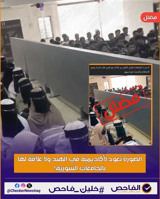 وراجت عبر صفحات التواصل الاجتماعي صورة مرفقة بادعاء مفاده: "سوريا… الجامعات تفصل الذكور عن الإناث مع فرض النقاب على النساء ومنع الاختلاط أو التحدث في ما بينهم".