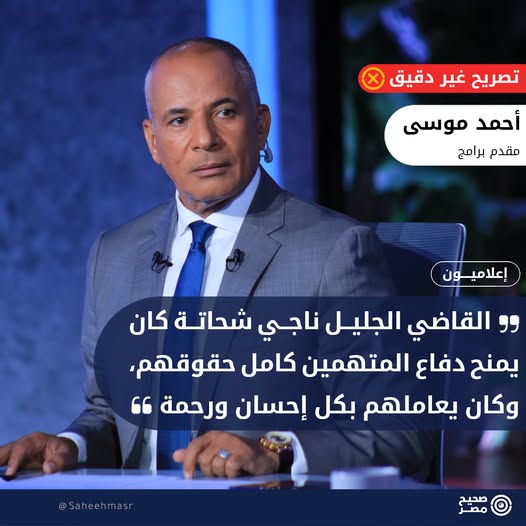 عقّب المذيع المصري أحمد موسى، على التفاعل الواسع مع وفاة القاضي الشهير محمد ناجي شحاتة، رئيس محكمة الجنايات ومحكمة أمن الدولة العليا سابقاً، قائلاً في تغريدة عبر حسابه على إكس: "القاضي الجليل ناجي شحاتة كان يمنح دفاع المتهمين كامل حقوقهم وكان يعاملهم بكل إحسان ورحمة".