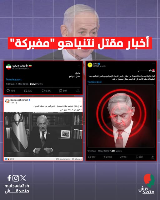 رصدت منصة "متصدقش" هذا التفاعل الواسع مع الادعاء، وتتبّعته حتى خلصت إلى أنه مفبرك إذ لم يرد الخبر على أي منصة موثوقة، أوعن أي جهة رسمية في إسرائيل. كما ظهر نتنياهو في مقطع فيديو، في 1 آذار/ مارس 2026، عبر حساباته الرسمية على مواقع التواصل الاجتماعي، والذي تحدّث خلاله باللغة الفارسية، وطالب فيه الإيرانيين بالتظاهر ضد النظام، محذراً من آلاف الهجمات التي سوف تشنها إسرائيل على النظام الذي وصفه بـ"الإرهابي" خلال الأيام القادمة. كما ظهر يوم 2 آذار/ مارس في جولة ميدانية في موقع قصف إيراني في القدس المحتلة راح ضحيته 10 أشخاص على الأقل.