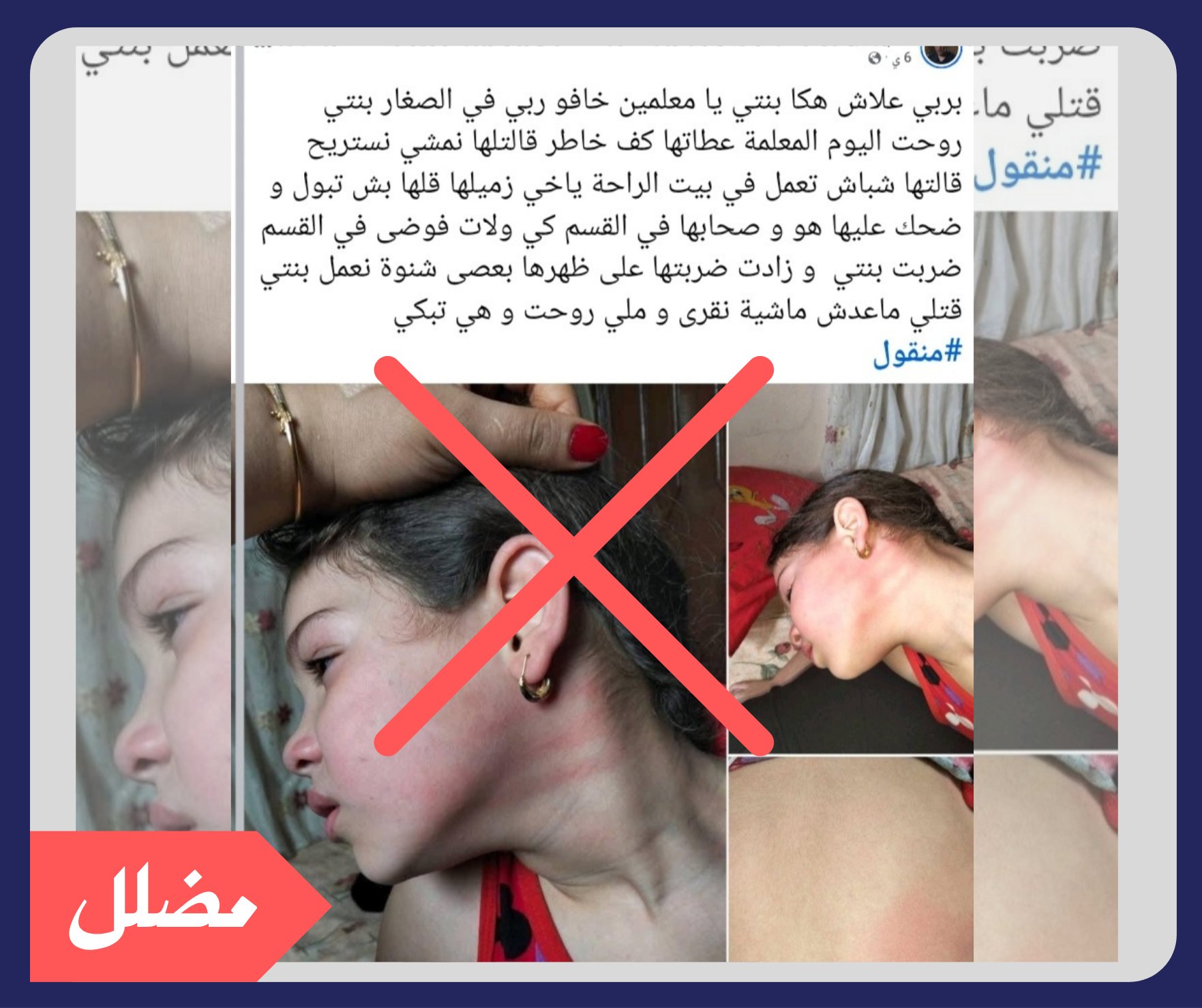 تداولت صفحات ومجموعات وحسابات على موقع “فيسبوك” في تونس خلال الأيام الماضية صورة لطفلة تبلغ من العمر حوالي 10 سنوات، تظهر عليها آثار عنف واضحة على مستوى الوجه والرقبة، يُرجَّح أنها نتيجة اعتداء جسدي. وادعى ناشرو الصورة أنها تعود لطفلة تونسية تعرضت للتعنيف من قبل معلمتها.