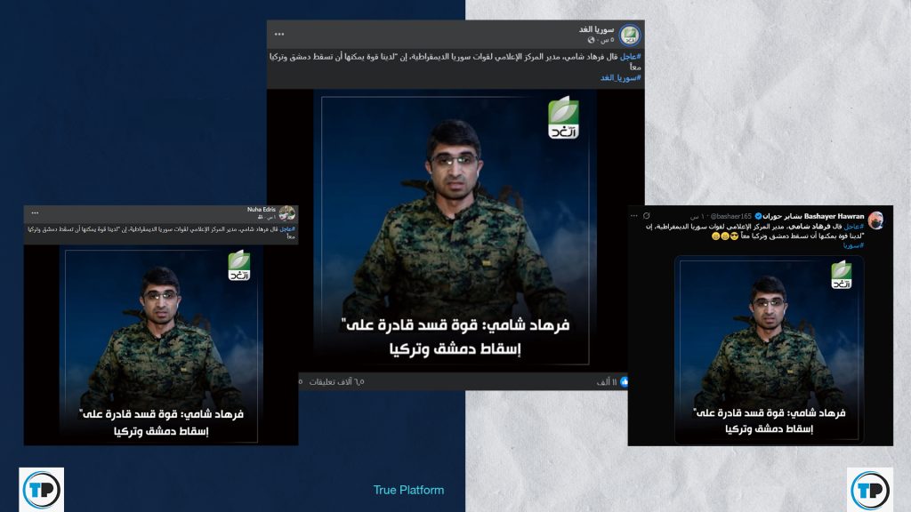 ✅ التصريحات المنسوبة لفرهاد شامي، حول قدرة قسد على إسقاط دمشق وتركيا معاً، ملفقة.