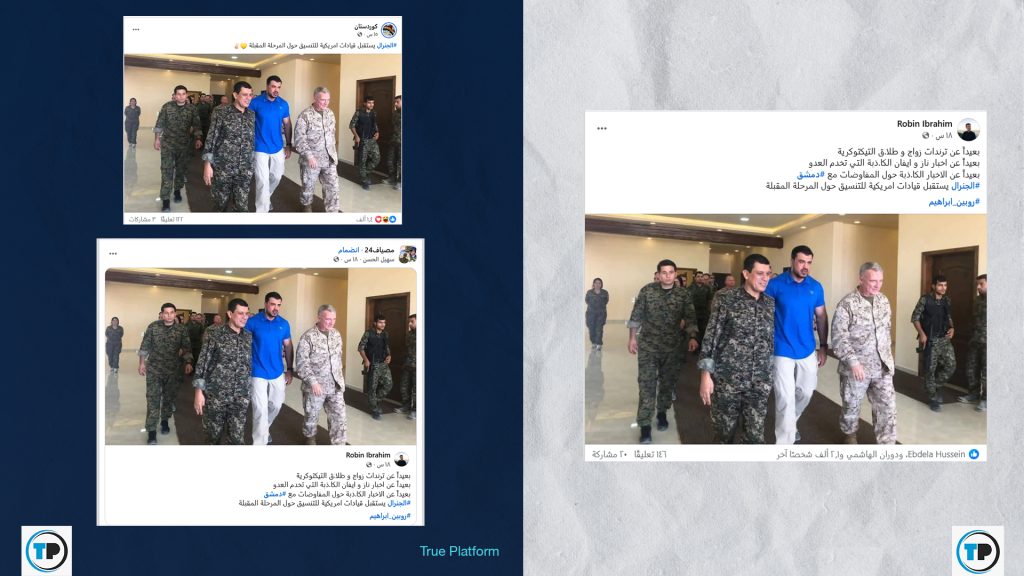 📍تداولت صفحات وحسابات عبر منصة فيسبوك، مؤخراً، صورة مرفقة بادعاء أنها تُظهر القائد العام لـ”قوات سوريا الديمقراطية” مظلوم عبدي وهو يستقبل قيادات أمريكية للتنسيق حول المرحلة المقبلة.