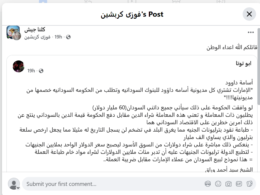 الادعاء مفبرك؛ إذ لم يرِد في أيّ منصة رسمية سودانية أو إماراتية. كما لم يثبُت صدور التصريح عن المحافظ الأسبق لبنك السودان الشيخ سيد أحمد.