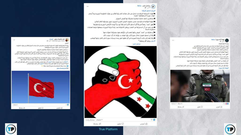 📍وزعم ناشروا التصريحات أن الدفاع التركية أشارت إلى استعدادها لتنفيذ عملية عسكرية مشتركة مع الجيش السوري، وذكرت بالمهلة المحددة لاندماج قسد مع نهاية العام، وحذرت من التعنت ورفض الانخراط تحت راية الدولة وأن تركيا لن تسمح بتحويل شمال سوريا إلى بؤرة فوضى.