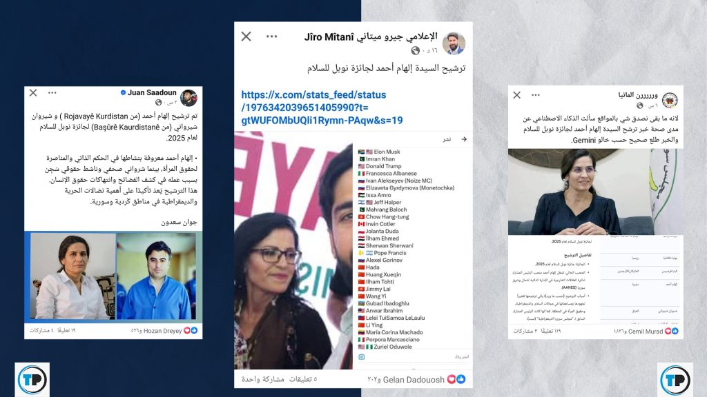 📍تداول #صحفيون ونشطاء إلى جانب حسابات وصفحات عبر منصات التواصل الاجتماعي، ادعاء حول ترشيح اسمي كل من #إلهام_أحمد الرئيسة المشتركة لدائرة العلاقات الخارجية في الإدارة الذاتية، والصحفي الكردي العراقي #شيروان_شيرواني لجائزة #نوبل_للسلام.