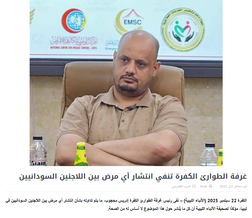 اتضح أن الادعاء مضلل، حيث قادنا البحث بالكلمات المفتاحية إلى تصريح لرئيس غرفة الطوارئ في الكفرة، إدريس المحجوب والذي نشرته صحيفة الأنباء الليبية على موقعها الرسمي بتاريخ 22 سبتمبر 2025، نفى فيه صحة ما يتداول حول انتشار أي أمراض بين اللاجئين السودانيين في المنطقة، مؤكداً أن هذه المزاعم لا أساس لها وأن أي حالة إصابة أو تفشٍ سيتم الإعلان عنها رسمياً عبر القنوات الصحية والجهات المختصة.