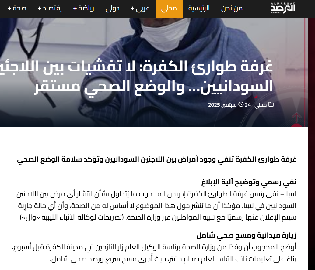 كما وأوضحت صحيفة المرصد الليبية بتاريخ 24 سبتمبر 2025 أن وفداً من وزارة الصحة زار النازحين في الكفرة وأجرى مسحاً صحياً شاملاً، وخلص إلى أن الأوضاع الصحية مستقرة ولا توجد مؤشرات على تفشيات وبائية. فيما أفاد موقع أخبار ليبيا إلى أن تغطية وسائل إعلام محلية متعددة أكدت النتائج ذاتها ونقلت تصريحات نفي رسمية، مبينة أن المعلومات المتداولة إما مبالغ فيها أو خارجة عن سياقها.
