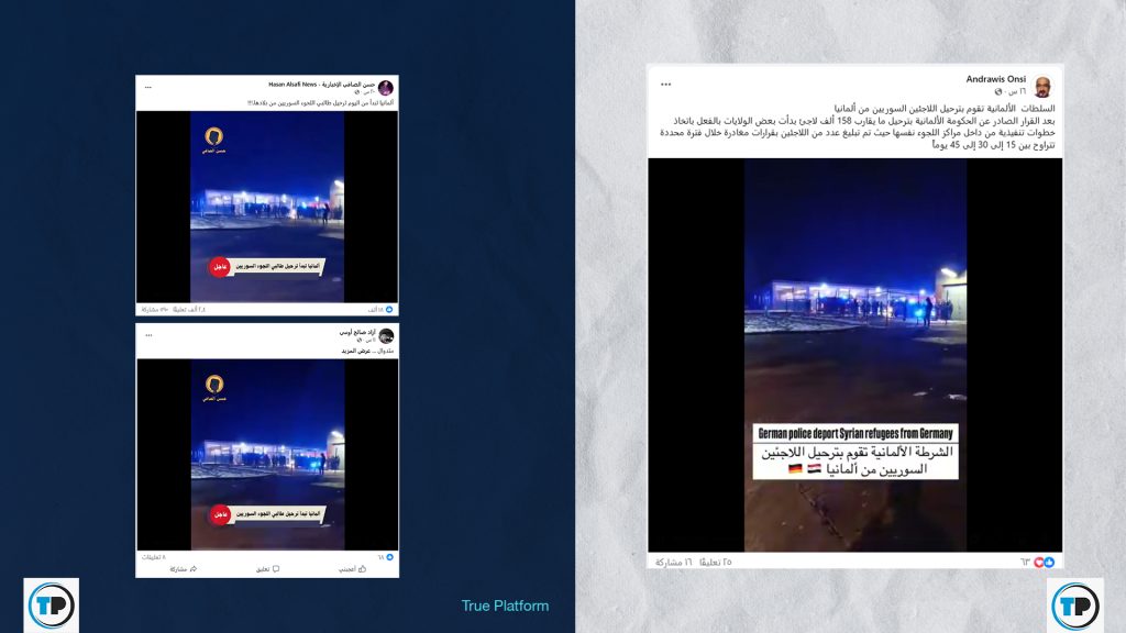 📍تداول نشطاء، وحسابات وصفحات على موقعي فيسبوك وإكس، مؤخراً مقطع فيديو مع ادعاءٍ يفيد بأن #ألمانيا بدأت بعمليات الترحيل #للاجئين_السوريين إلى بلادهم.