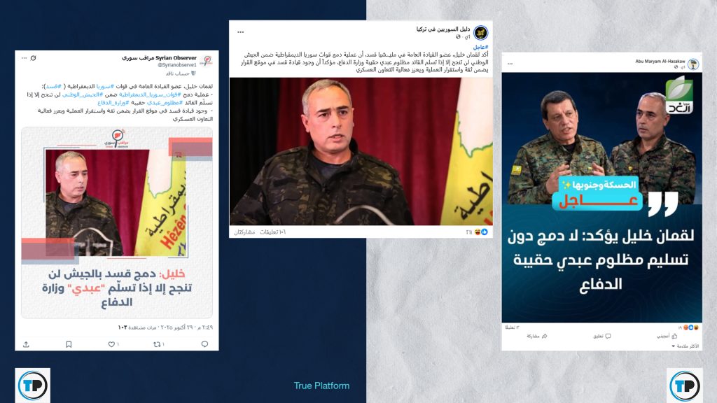 ✅ الادعاء بأن عضو القيادة العامة في "قسد"، لقمان خليل، اشترط نجاح عملية دمج قواتهم في الجيش السوري بتولّي مظلوم عبدي وزارة الدفاع، ملفّق.